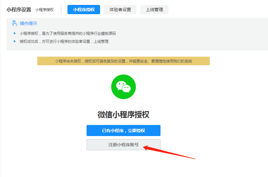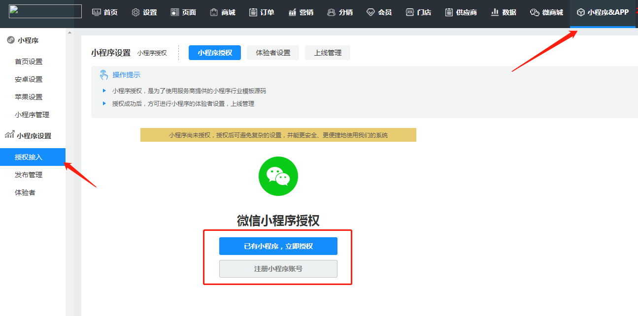 首先,我们需要在这里看下,小程序怎么授权给商城后台