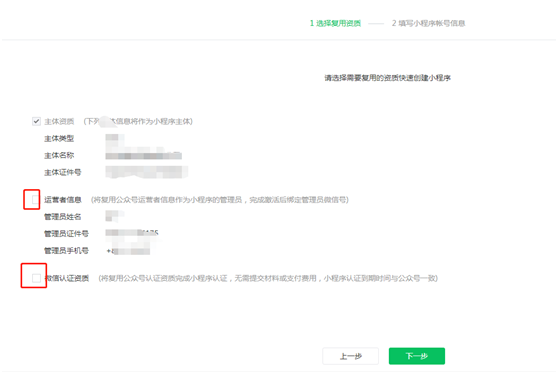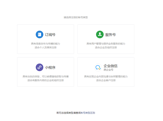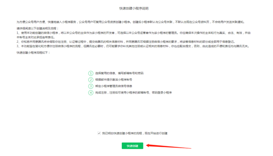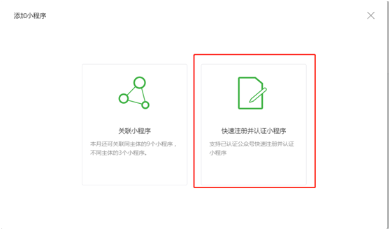 2、 已有小程序可以直接进行跟公众号绑定,没有直接从公众号里面复用公众号主体信息认证申请小程序,下面我们选择第二个快速注册并认证小程序