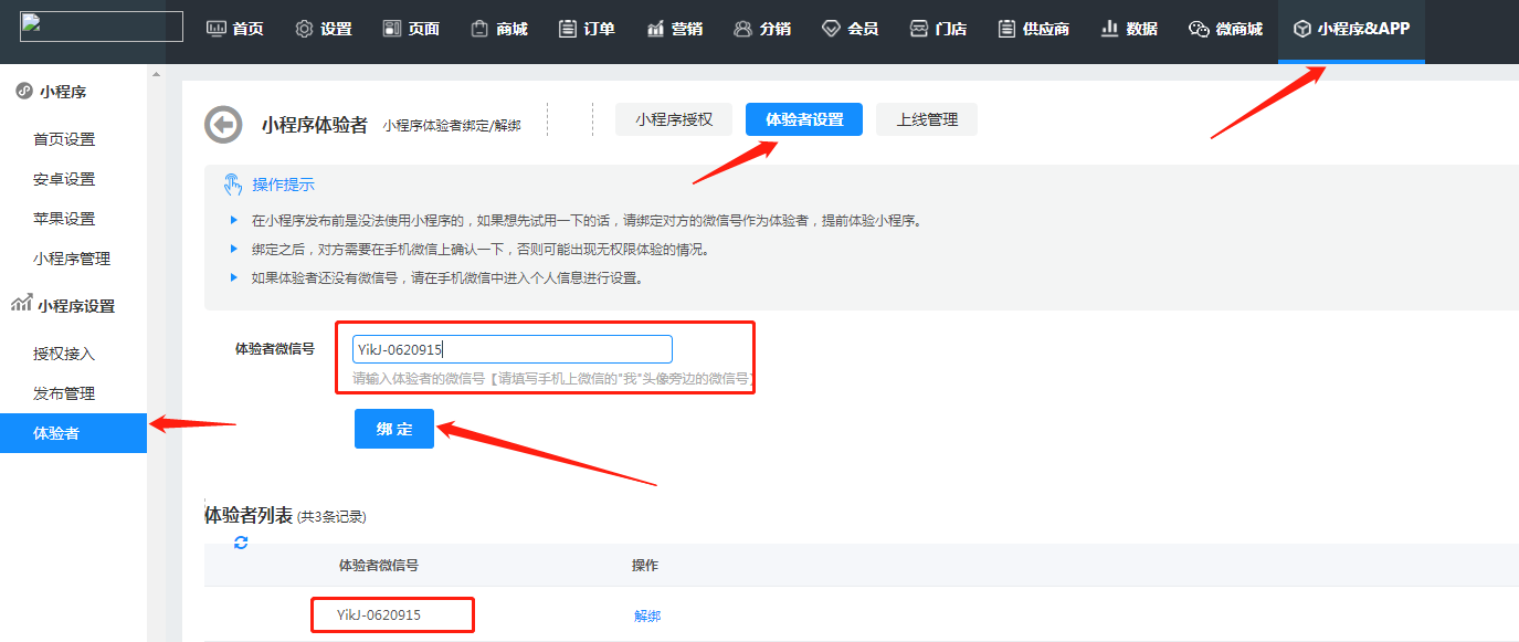 肯定是需要先绑定我们的体验者了,体验者怎么绑定?输入我们需要体验用户的微信号就行了