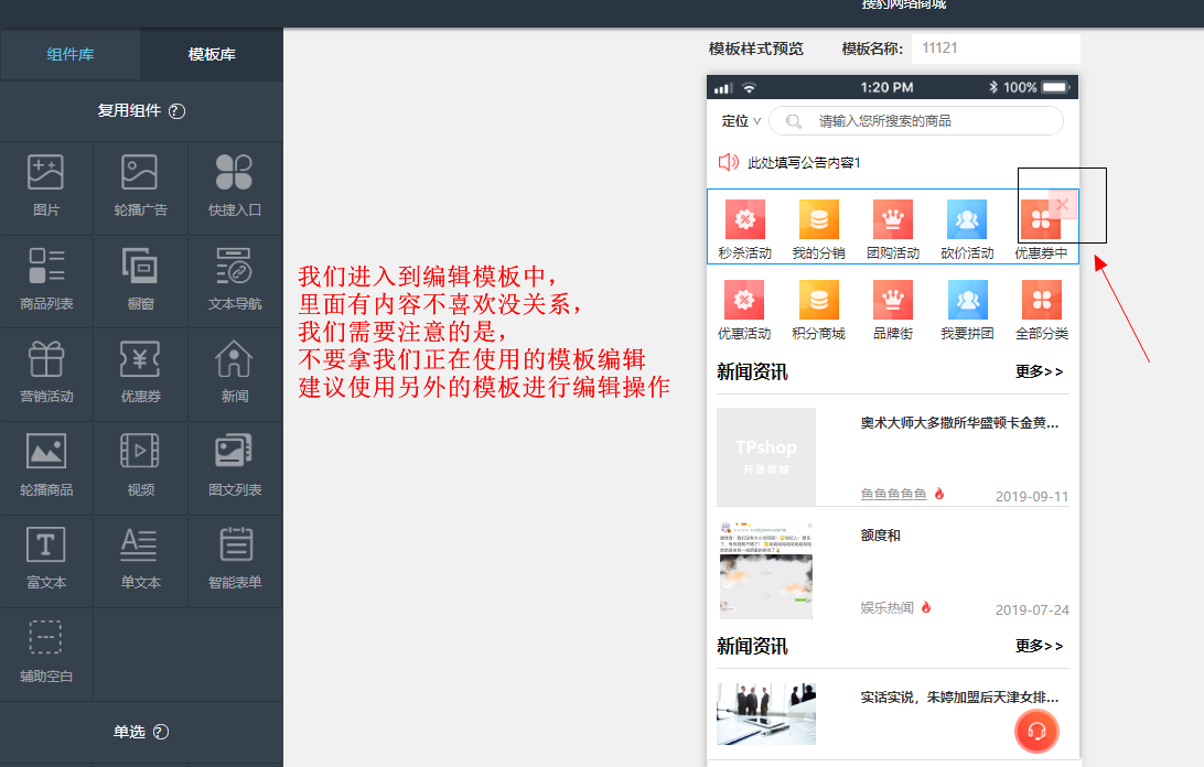 我们的优惠卷需要自己设置之后,然后添加了优惠券的组件后我们能自由选择要上架什么优惠券