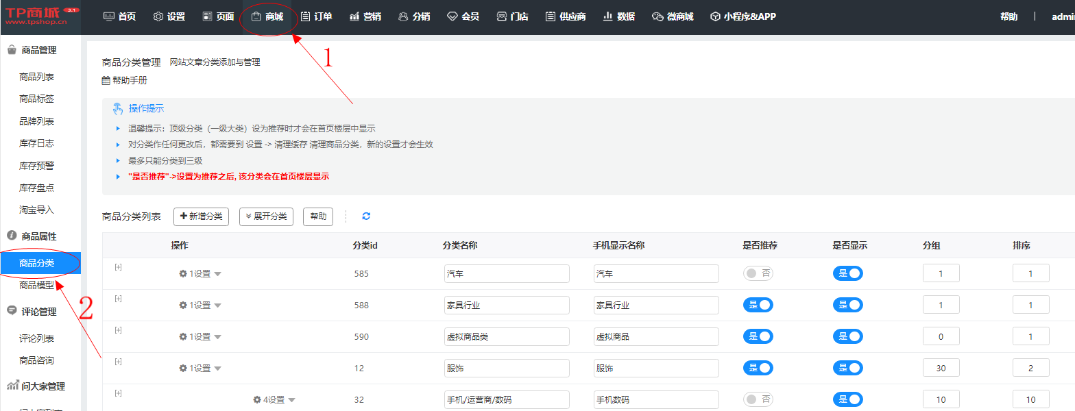 平台位置:商城--商品属性--商品分类