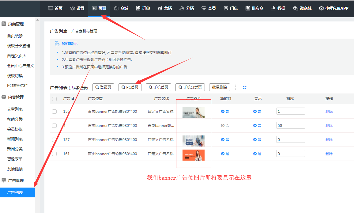 banner广告位轮播位置:页面--广告管理--广告列表