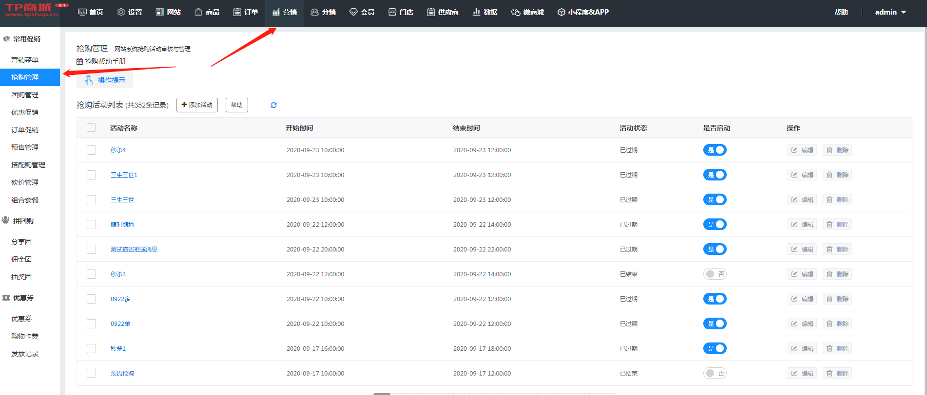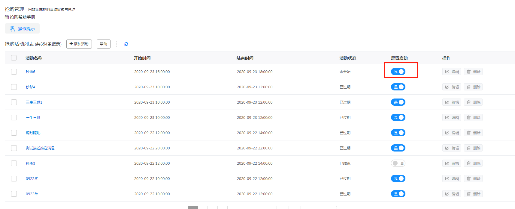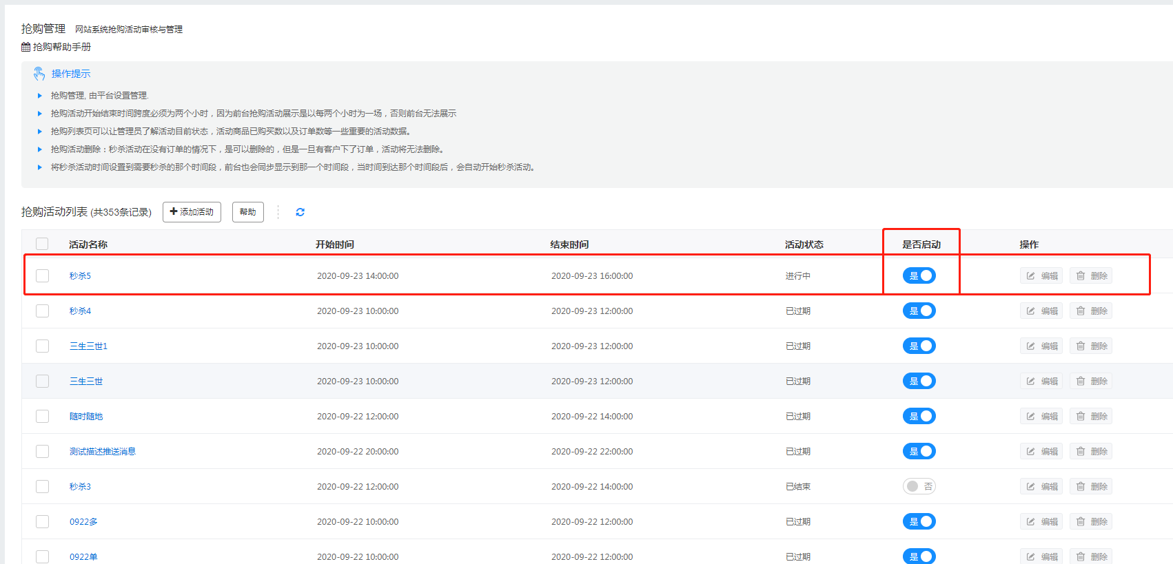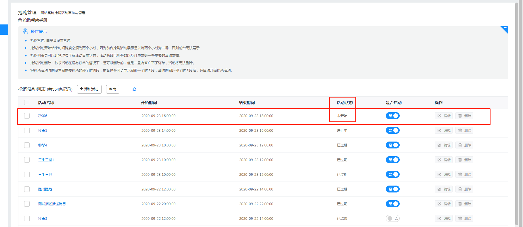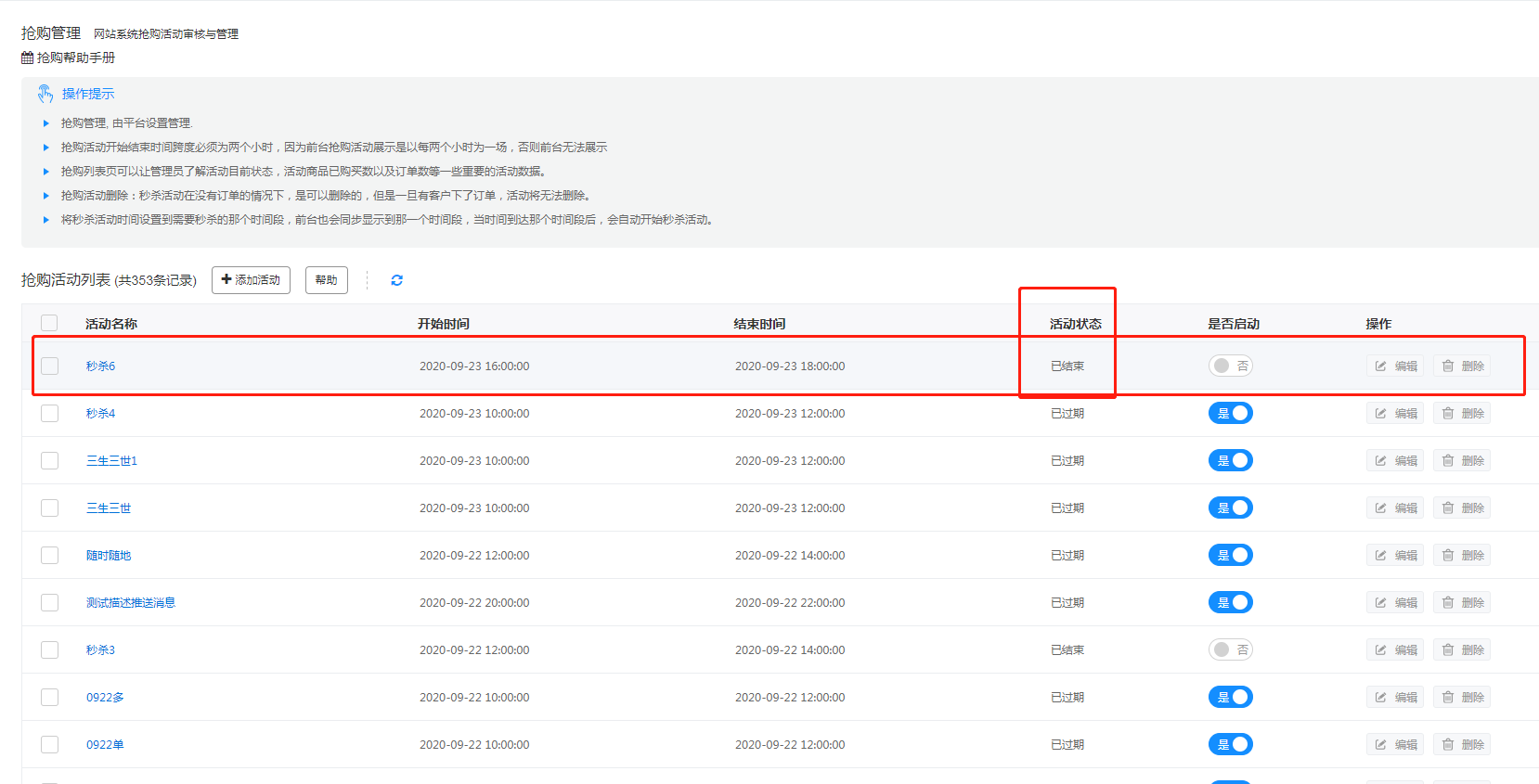 已结束:活动开关关闭就是已结束状态(活动时间内,参与活动的商品库存售完也是已结束)