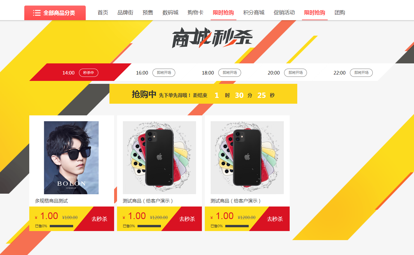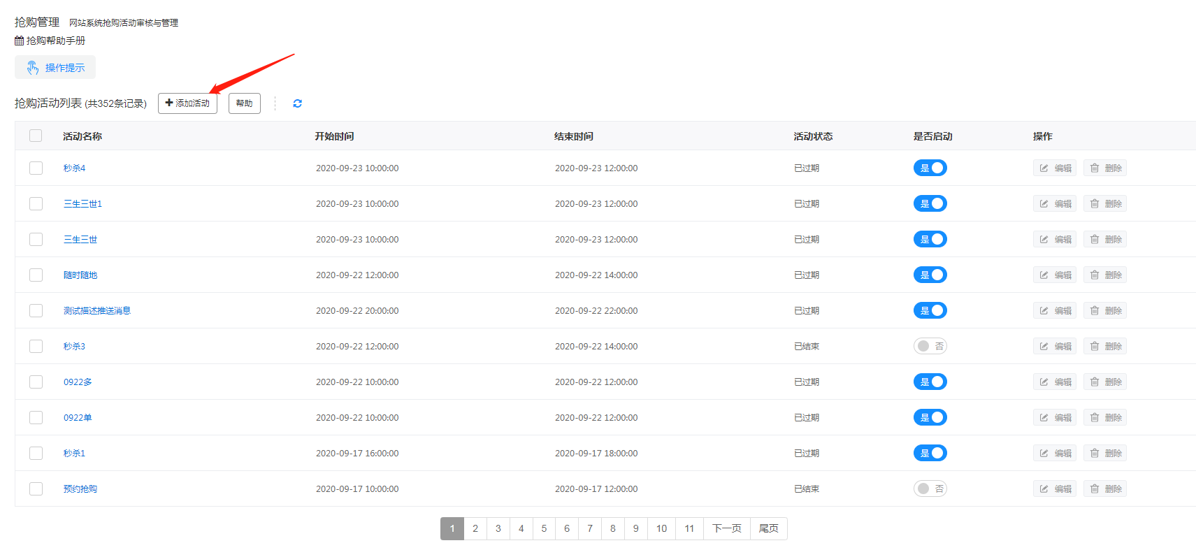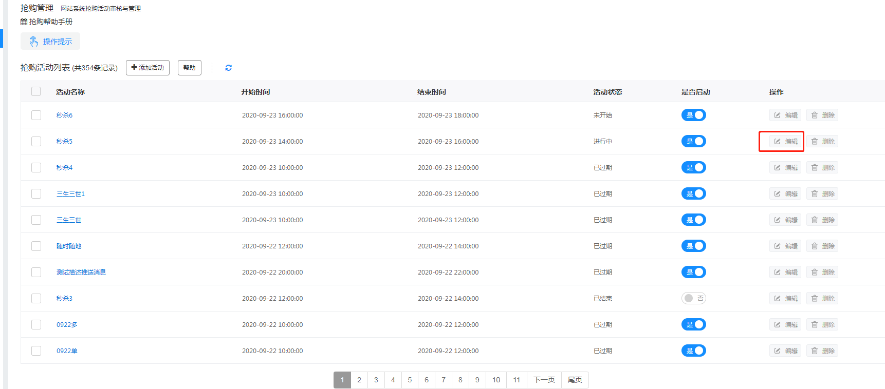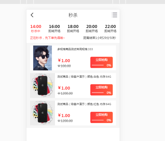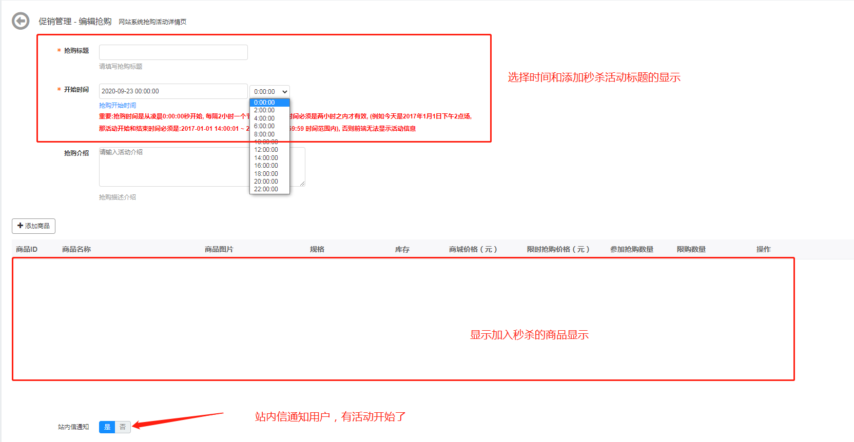 已结束:活动开关关闭就是已结束状态(活动时间内,参与活动的商品库存售完也是已结束)