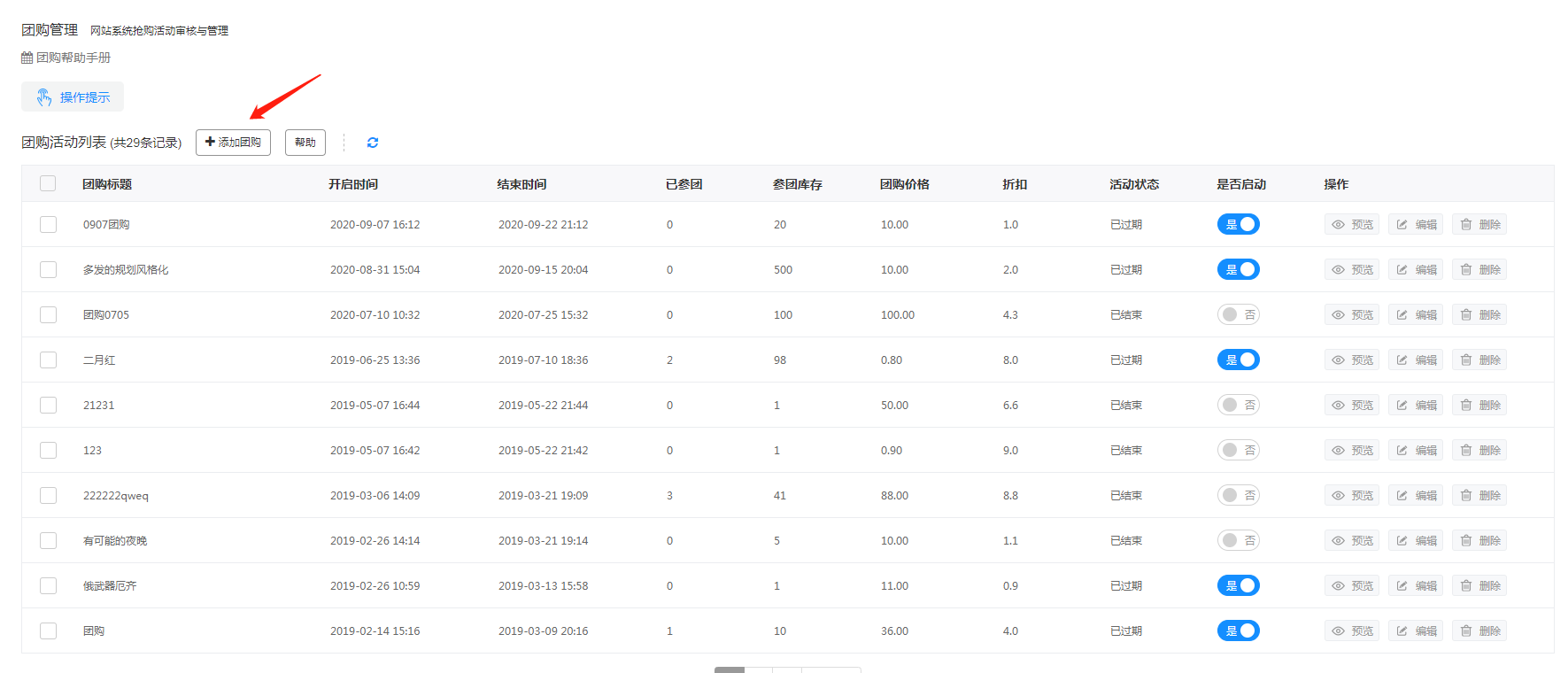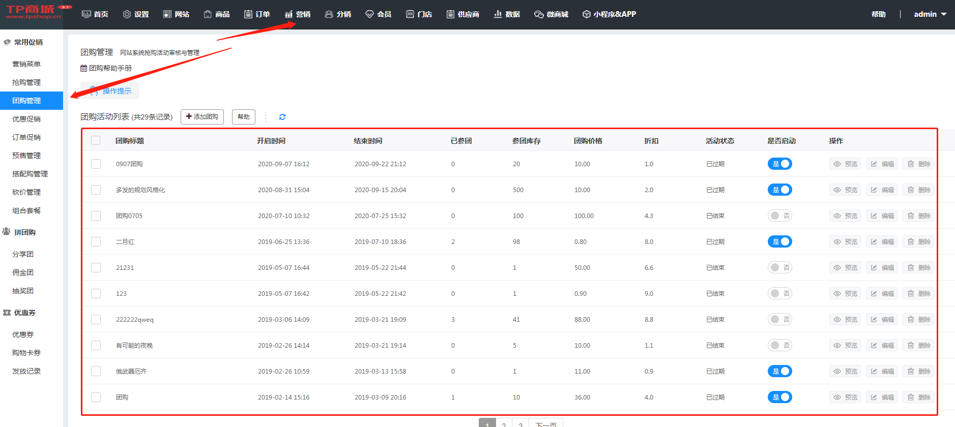 平台位置:营销--常用促销--团购管理