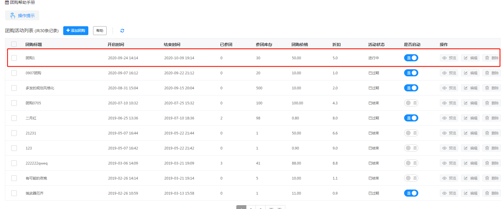 首先我们来看一下团购列表,管理者可以在极短时间了解到某个团购活动目前处于的活动状态,已参团数据等信息。