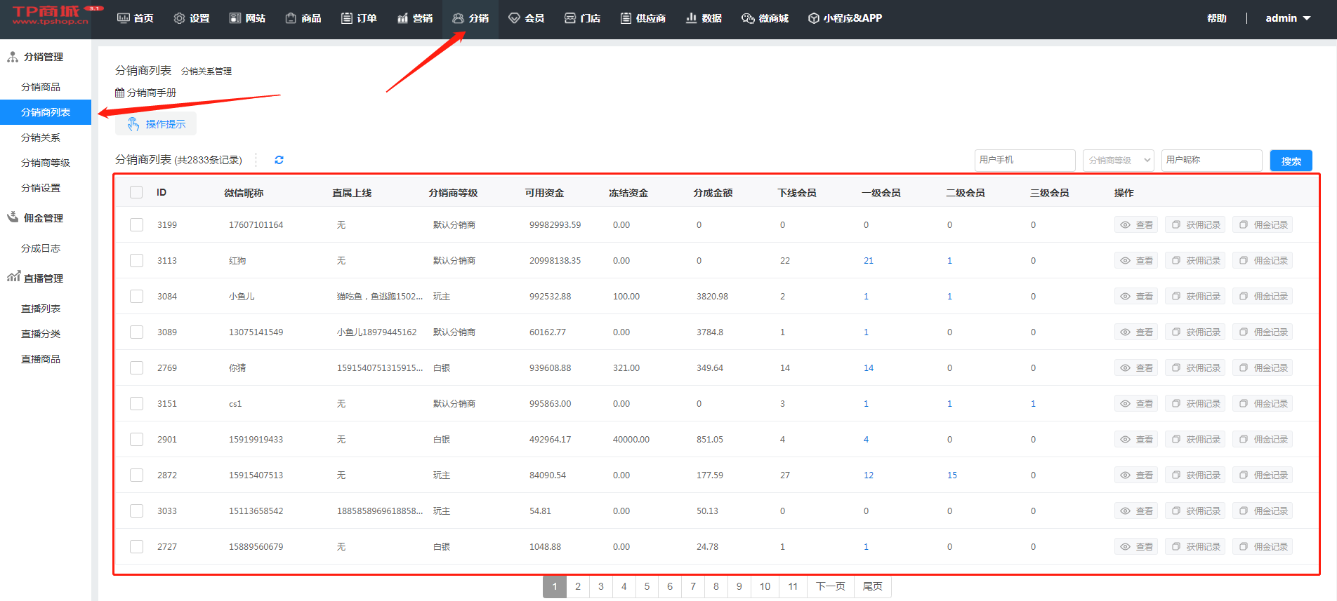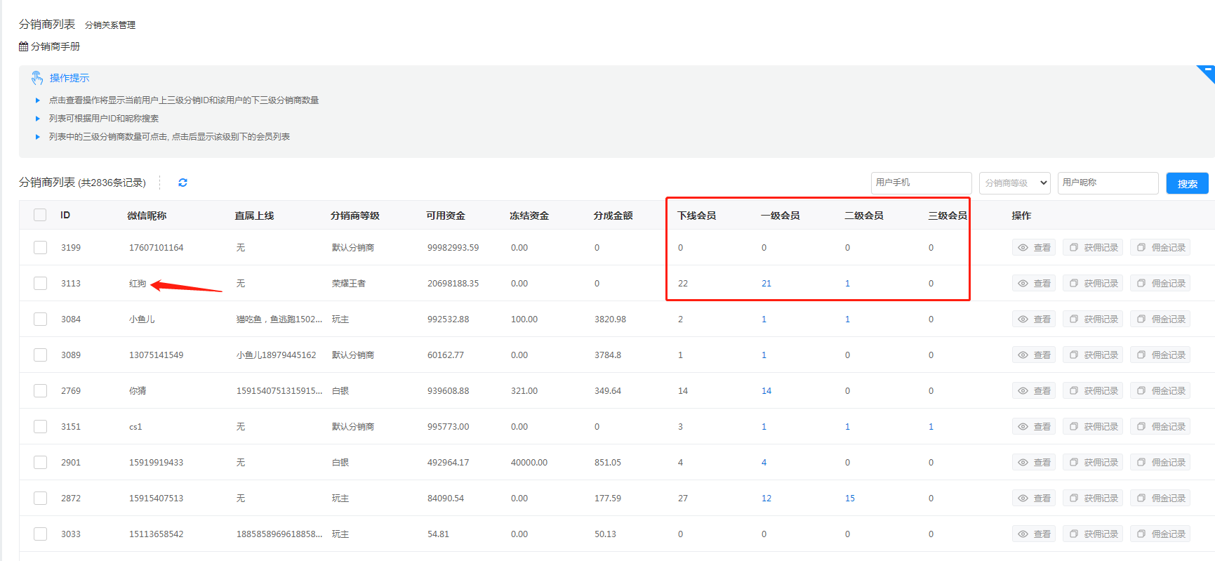分销商列表是管理所有参与分销的会员,可查看每级下线会员数