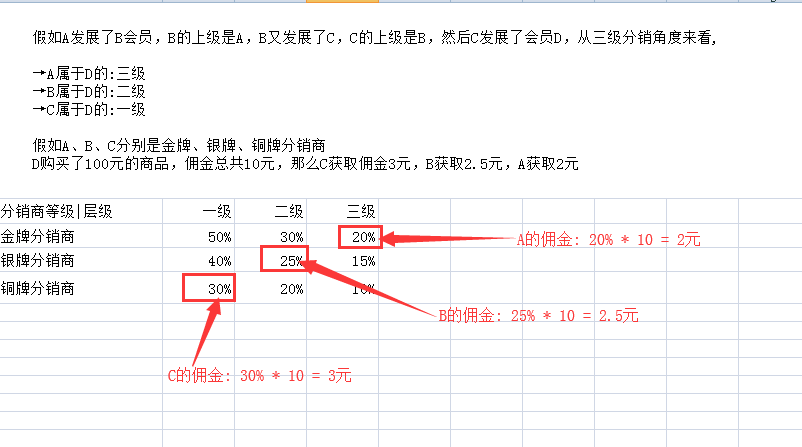 比如C是铜牌分销商 铜牌分销商的返利规则是 一级30% 二级20% 三级10%