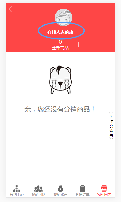 查看自己的店:点击“我的微店”按钮,就可以看到,里面目前是没有任何分销商品的!如下图: