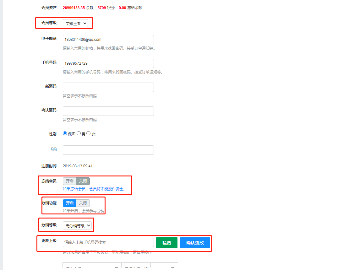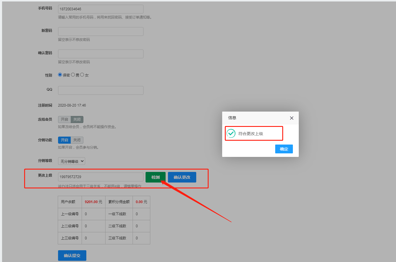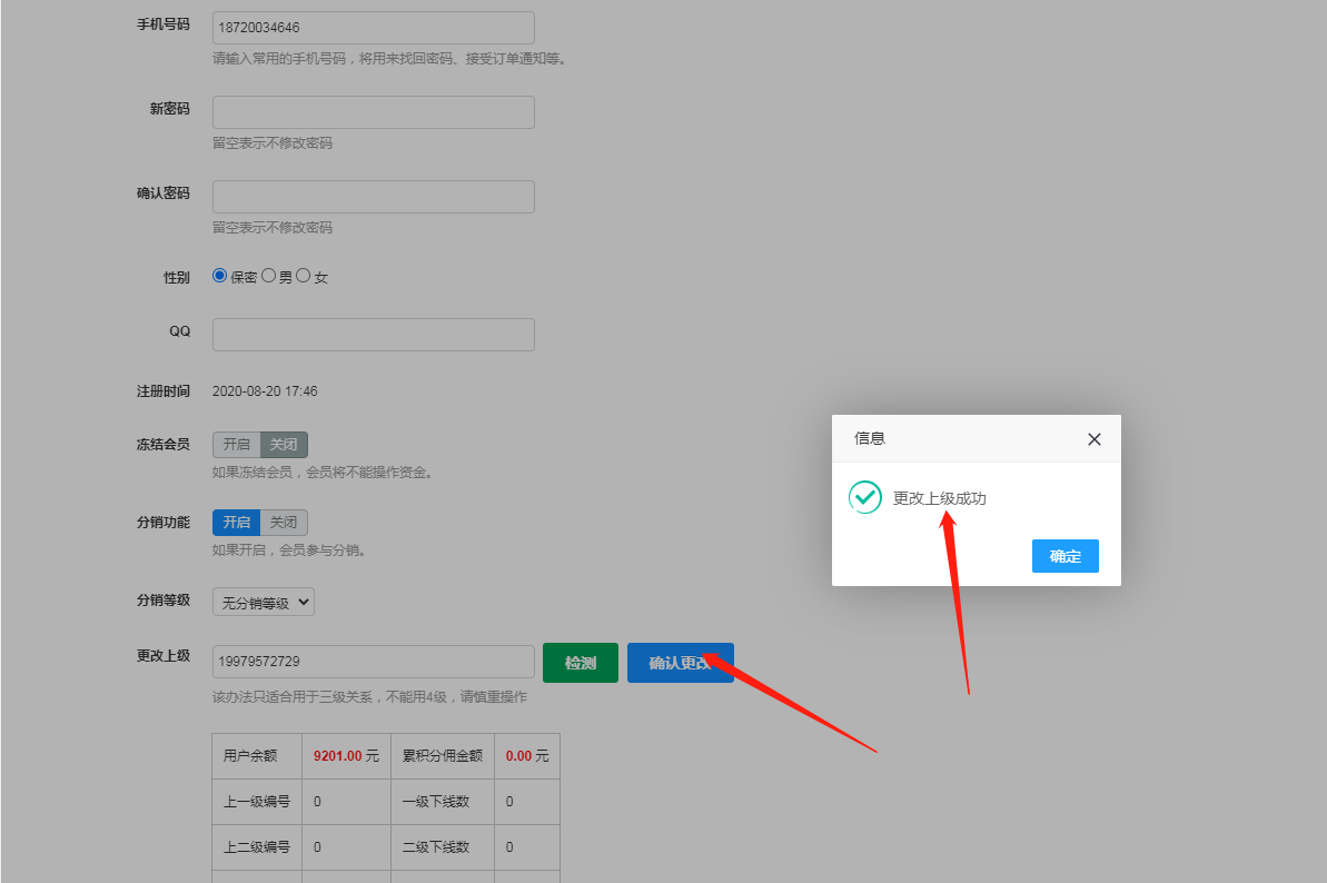 4、更改上级,加入我想要这个会员是我的下级,在此只需要在该会员的更改上级处输入自己的会员账号即可,下线购买可参与分销返佣