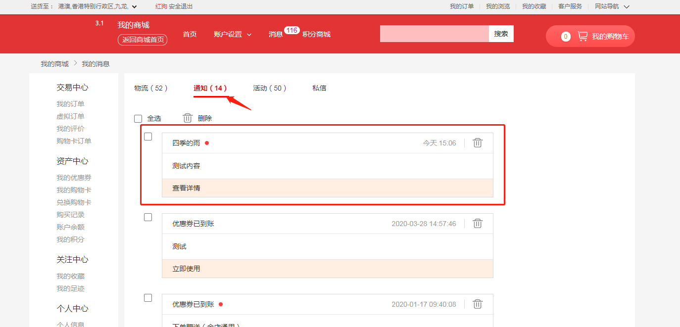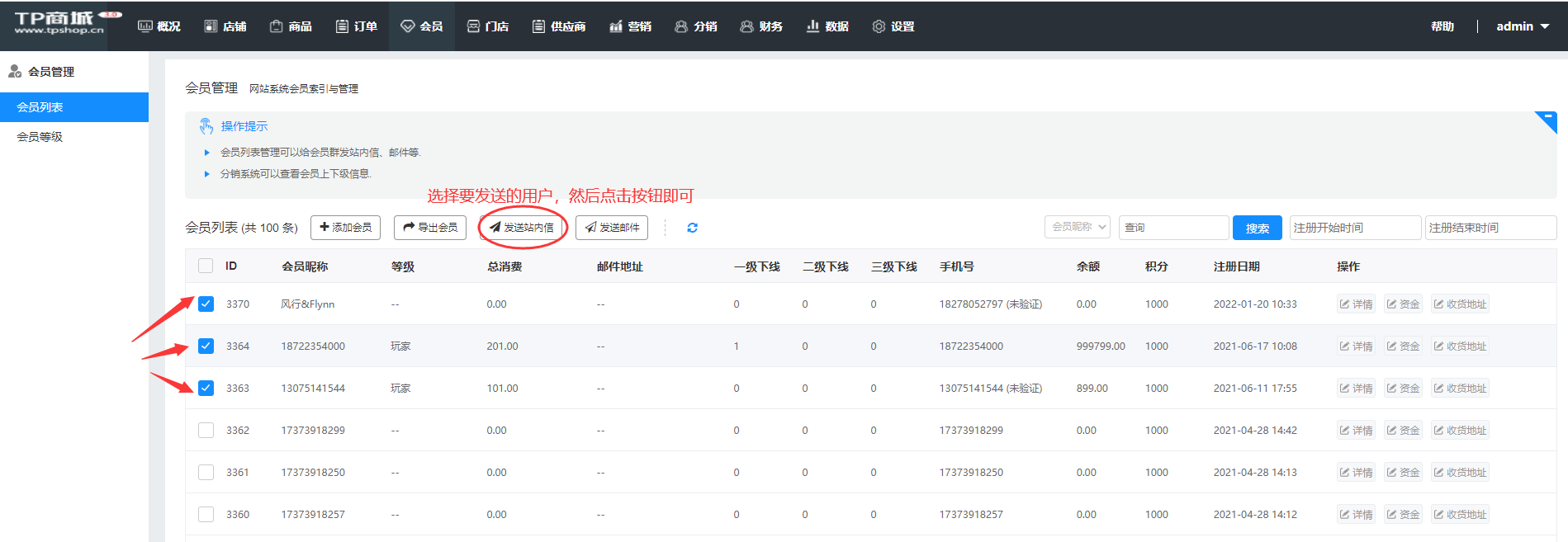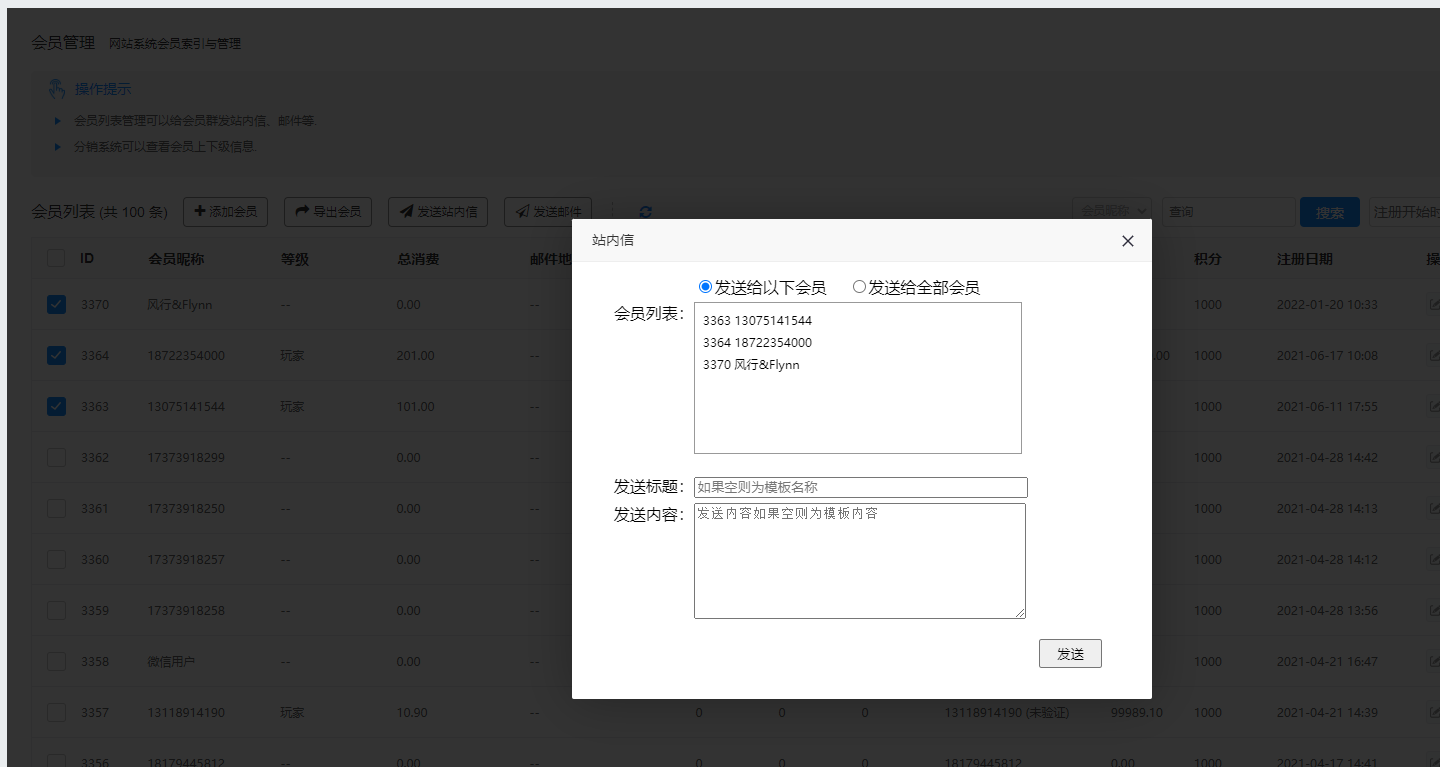 发送站内信功能,主要是给会员发送信息,会员收到信息(也可以勾选发送给全部会员,当做预发布一些信息通知类的)