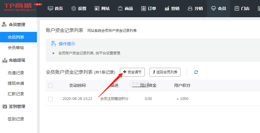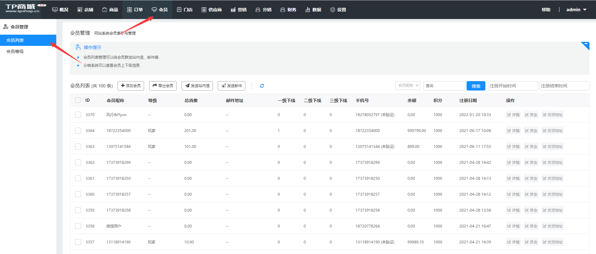 平台定位:会员--会员管理--会员列表