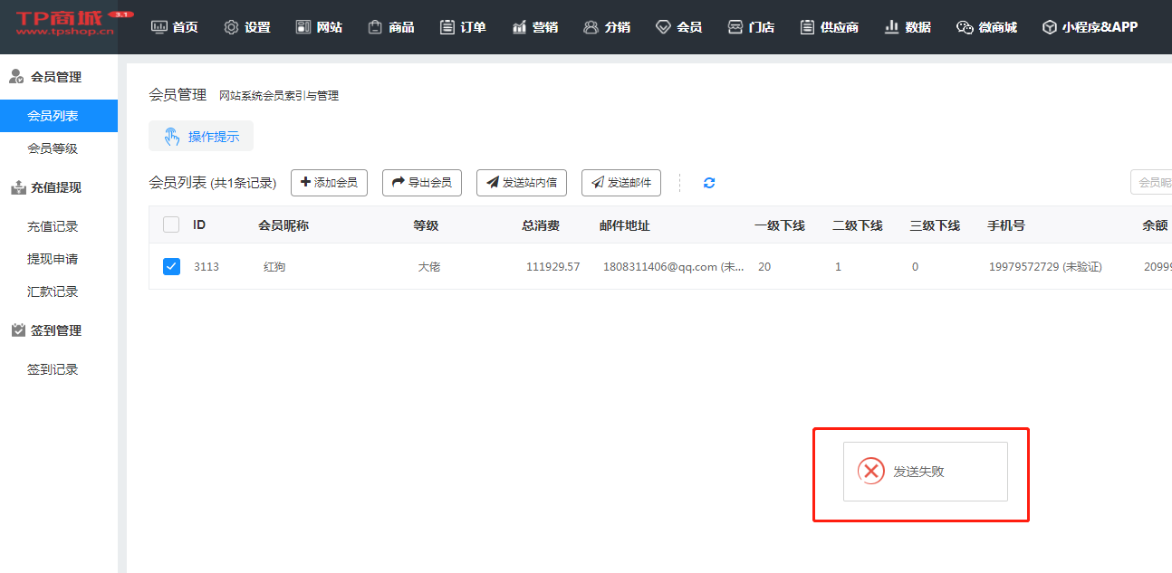当发送邮件给会员的时候,会提示错误,这个时候需要排查一下,邮箱是否已经配置