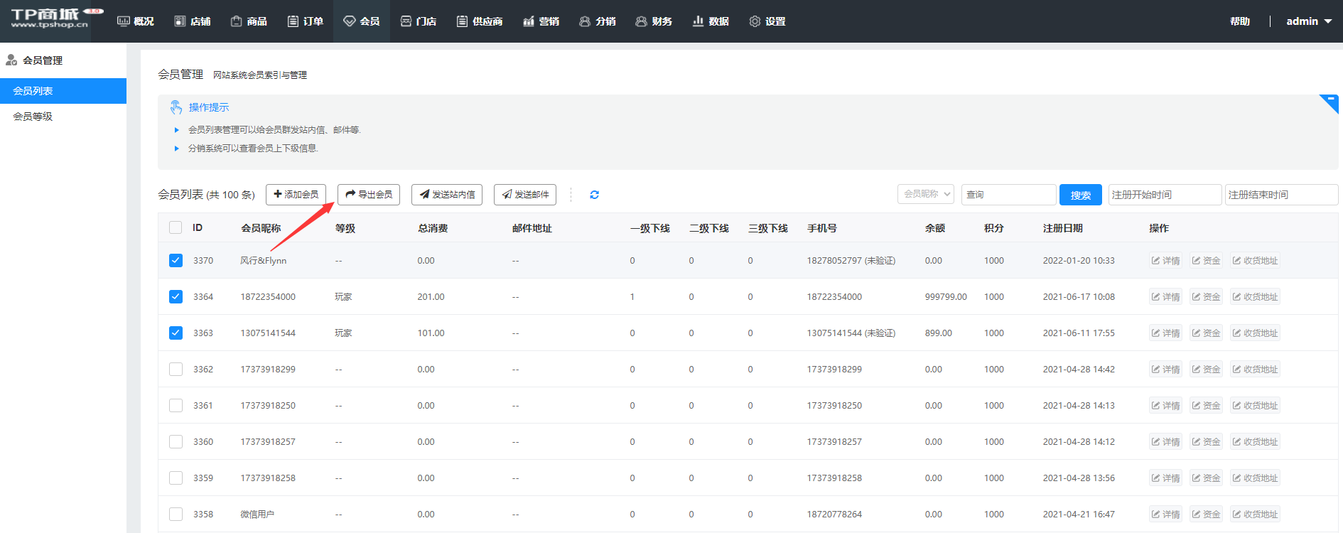 导出会员功能,选择需要导出的会员