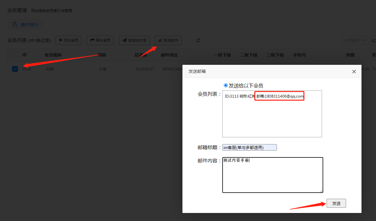 发送邮件功能,发送活动或者其他一些通告类的信息给会员,前提是会员邮箱填写正确的