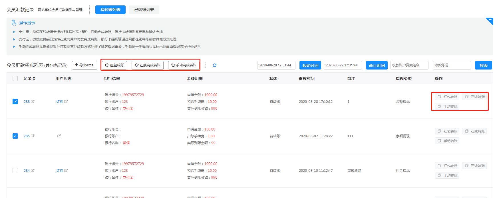 我们系统提供以下三种转账方式: