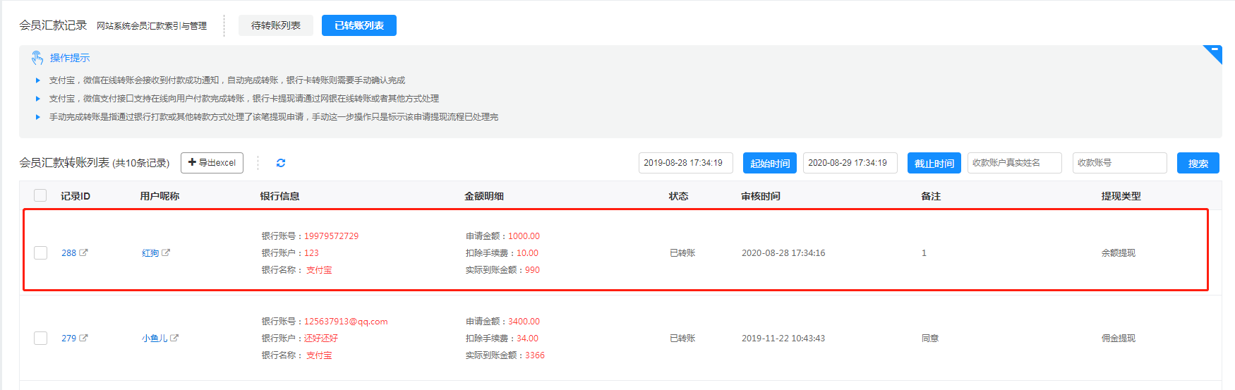 没错,就在已转列表中查看,财务需要统计当月或者一定时间段的提现支付怎么办呢,导出功能又可以实现了
