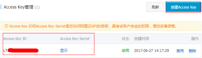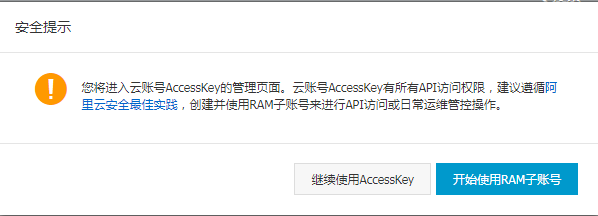 选择 继续使用AccessKey,如果还没有accesskeyid,创建一个,由下面获取accessKeyId和keySecret。