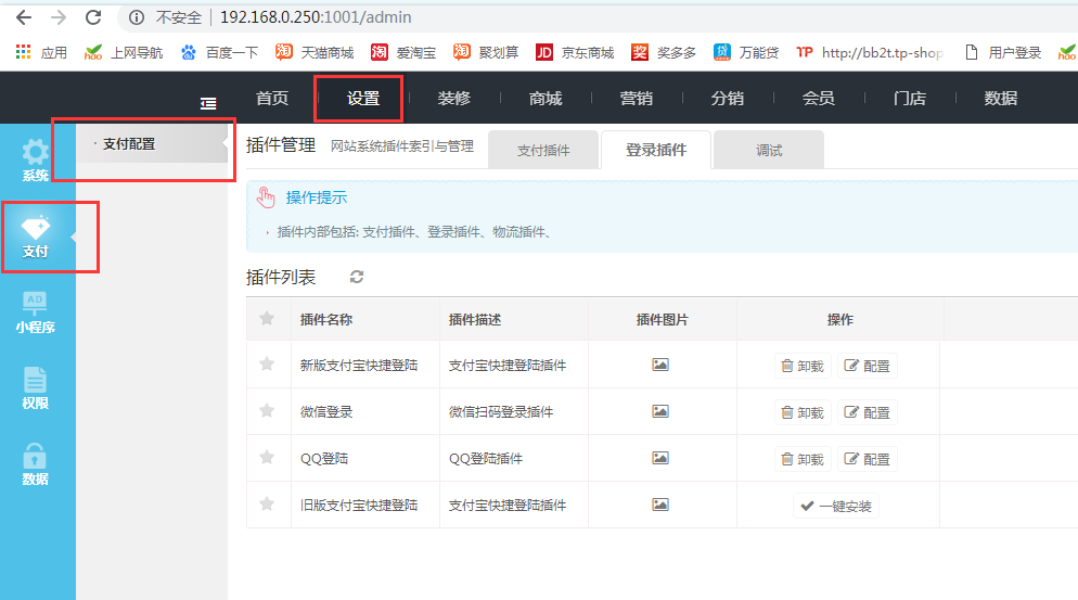 新版路径:设置--支付--支付配置--登录插件
