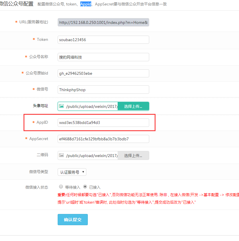token、Appid、AppSecret要与微信公众开放平台信息一致。