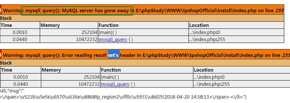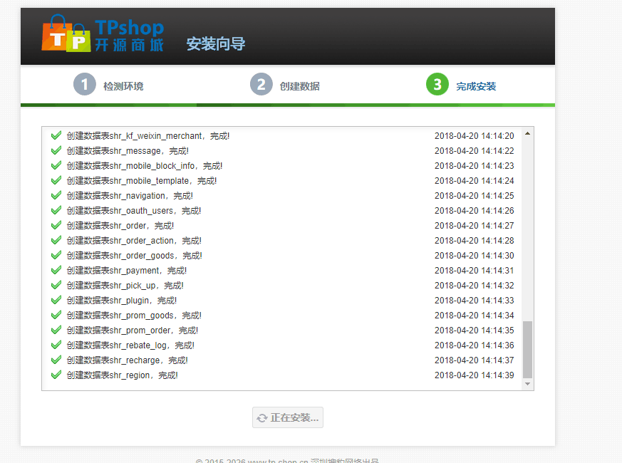 安装系统TPshop的时候在第三步"创建数据库"页面一直卡住不动(如下图)