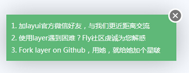 1 2 3 4 | layer.msg(也可以这样, { time: 20000, //20s后自动关闭 btn: [明白了, 知道了] }); |