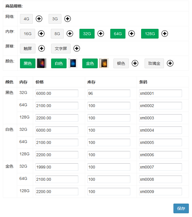 1 2 3 4 5 6 7 | 再看看后台对应的设置,手机例子 颜色:黑色 白色 金色内存:32G 64G 128G 因为 黑色手机也有 32G 64G 128G , 然后白色手机也有32G 64G 128G 金色手机也有 32G 64G 128G 所以这里是有9种组合9种价格 9种库存 9种条码 当拿到其中一个条码时就知道这个商品(手机)是什么规格是什么颜色什么内存等。。。。下面来看看表结构设计 |
