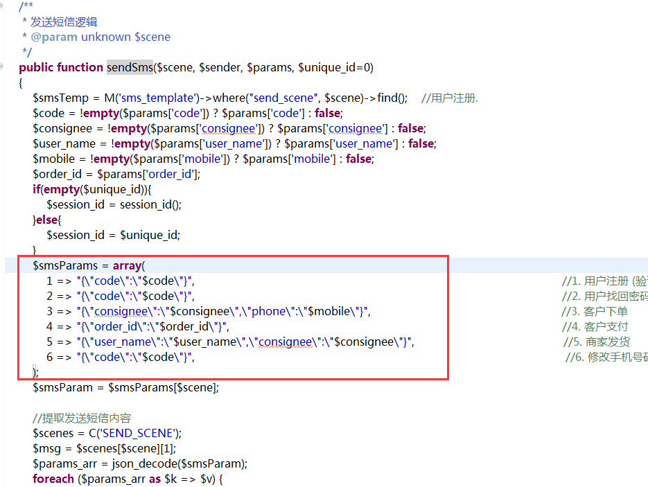 对比$smsParams和SEND_SCENE会发变量是一一对应的.