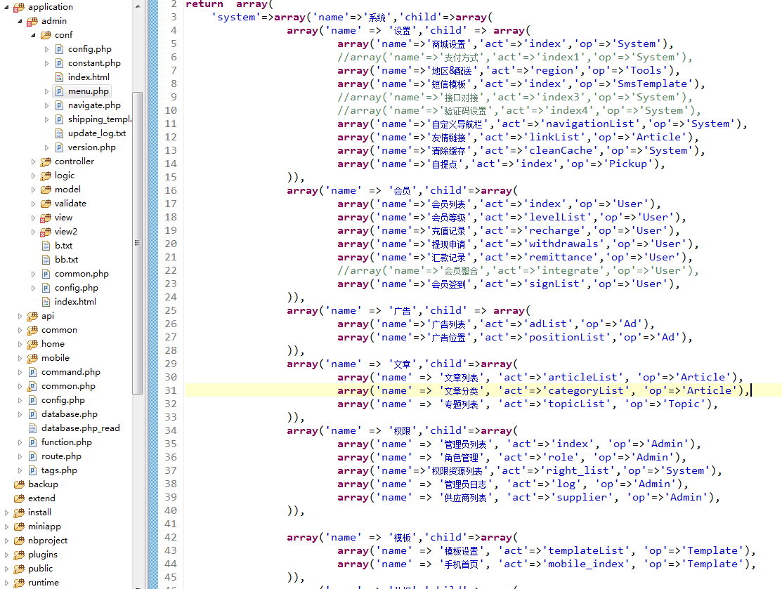 在针对系统后台二次开发的过程中,如果需要添加后台菜单,先找到后台目录里的菜单配置文件,按照对应的控制器+方法名的格式添加菜单