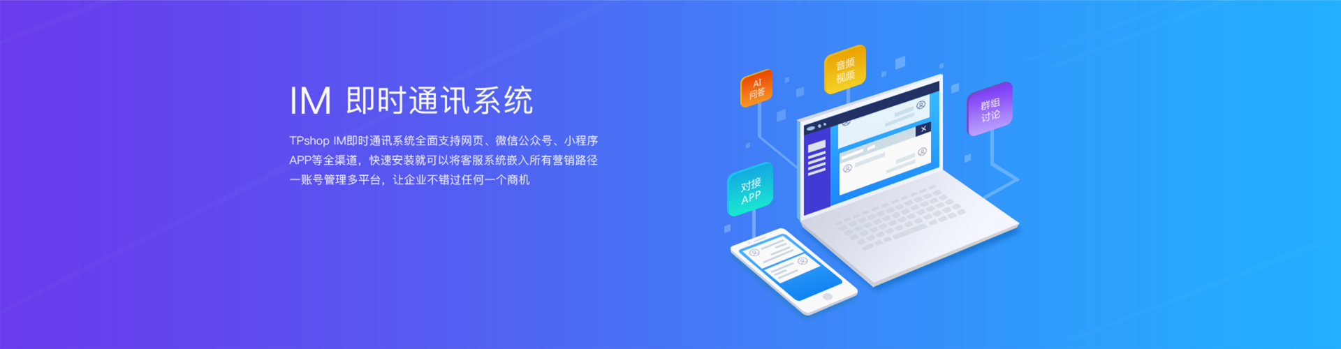 TPshop IM系统同时兼容PC端、手机网页版、客户端/APP、SNS等多种平台,PC端+移动端为您解决营销后顾之忧