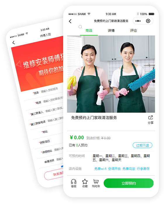 用户提交订单、可查看订单状态、对商家进行的评价,完善各项资料;可预约上门服务或购买到店服务 让服务更加便捷,提高效率